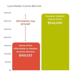 The gap is widening: In Houston, people earning an average local salary are about $176,000 short of being able to buy a median-priced home.